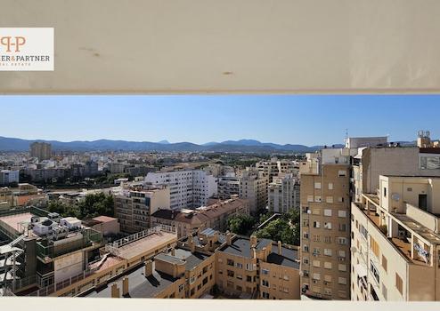 Willkommen in Ihrem neuen Zuhause in luftiger Höhe: Dieses großzügige Apartment auf der 13. Etage bietet einen einzigartigen Panoramablick, der sich vom Mittelmeer und der Kathedrale bis hin zur Serra de Tramuntana und der gesamten Bucht von Palma erstreckt.