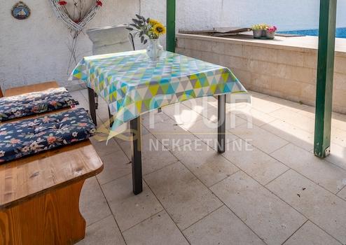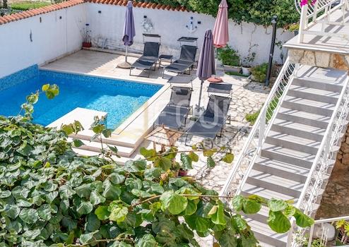 Zum Verkauf steht ein freistehendes Haus mit Swimmingpool in Fažana, mit einer Gesamtfläche von 220 m² und einem Grundstück von 445 m², nur 500 Meter vom Meer entfernt. Das Haus wurde 2000 renoviert und umfasst vier Wohnungen. Im Erdgeschoss befinden sich zwei Einzimmer- und eine Zweizimmerwohnung, die während der Saison vermietet werden, während sich im ersten Stock eine Wohnung mit Außentreppe befindet. Das Dachgeschoss bietet die Möglichkeit, zusätzlichen Wohnraum von etwa 50 m² zu schaffen.