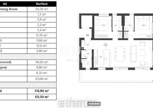Im ruhigen und charmanten Ort Zaton, nur 45 Meter vom Strand entfernt, befindet sich ein neues modernes Gebäude mit zwei Eingängen und zwei Aufzügen, in dem sich zehn exklusive Wohnungen verbergen. Jede wurde sorgfältig entworfen, um ein Höchstmaß an Komfort und Genuss zu bieten – die Wohnungen im Erdgeschoss sind mit privaten Gärten ausgestattet, die Wohnungen in den mittleren Stockwerken haben geräumige Terrassen, während die Penthäuser Dachoasen mit Installationen für Sommerküchen und Whirlpools bieten, ideal für entspannte abendliche Zusammenkünfte bei Sonnenuntergang. Alle Wohnungen sind mit Klimaanlage in jedem Zimmer ausgestattet, während die Penthäuser zusätzlich im gesamten Innenbereich über Fußbodenheizung verfügen. Wohnung A4 im ersten Stock mit einer Nettofläche von 121,5 m2 kombiniert Funktionalität und Eleganz. Die Aufteilung umfasst zwei Schlafzimmer, zwei Badezimmer, eine zusätzliche Toilette, eine Küche und ein helles Wohnzimmer. Was sie auszeichnet, ist die geräumige überdachte Terrasse, die Innen- und Außenbereich perfekt verbindet. Zur Wohnung gehören außerdem zwei Parkplätze und ein Abstellraum. Zur Ausstattung gehören elektrische Rollläden, Sicherheitstüren und eine Video-Gegensprechanlage. Käufer haben zudem die Möglichkeit, die komplett möblierte Wohnung zu übernehmen, sodass sie sorgenfrei einziehen können. Ein besonderer Vorteil: Der Käufer ist von der Grundsteuer befreit, da der Verkäufer eine juristische Person ist. Zaton ist bekannt für seine langen Kiesstrände, das kristallklare Meer und die friedliche Atmosphäre, die traditionelles dalmatinisches Flair mit modernen Annehmlichkeiten verbindet. In unmittelbarer Nähe befindet sich ein Resort mit zahlreichen Annehmlichkeiten – Restaurants, Cafés, Sportplätzen und Wellnessprogrammen –, was diesen Ort ideal für Urlaub und Leben das ganze Jahr über macht. Nur zehn Autominuten entfernt liegt Zadar, eine Stadt reich an Geschichte und Kultur, weltberühmt für ihre römischen Foren, romanischen Kirchen, die Meeresorgel und den Gruß an die Sonne. Wenn Sie eine Kombination aus Luxus, Komfort und mediterranem Lebensstil suchen, kontaktieren Sie uns für weitere Informationen und die Vereinbarung einer Besichtigung.