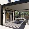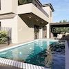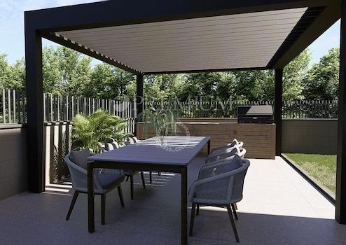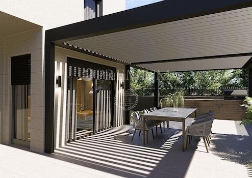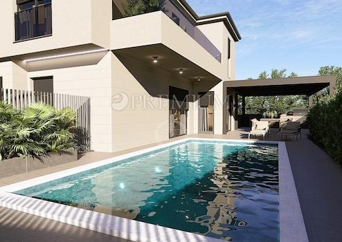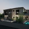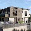 Jede Wohneinheit hat ein Erdgeschoss mit einer Nettowohnfläche von 55 m², bestehend aus einem offenen Wohnzimmer mit Küche und Essbereich, einem Gäste-WC und einem Abstellraum. Vom Wohnzimmer aus gelangt man auf die überdachte Terrasse und den mediterran gestalteten Garten mit einem 21 m2 großen Pool und Sonnenterrasse. Das Obergeschoss mit einer Fläche von 62 m² umfasst ein Hauptschlafzimmer mit Bad, zwei Schlafzimmer, ein Badezimmer und eine Terrasse.