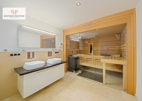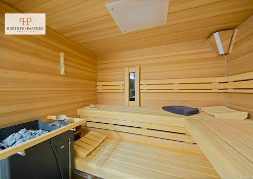 Im Untergeschoss befinden sich ein separates Gästeapartment (aktuell als Fitnessbereich genutzt) mit eigenem Bad, zwei weitere Zimmer, eine Sauna sowie die Garage mit Platz für zwei Fahrzeuge. Insgesamt können bis zu fünf Schlafzimmer realisiert werden.