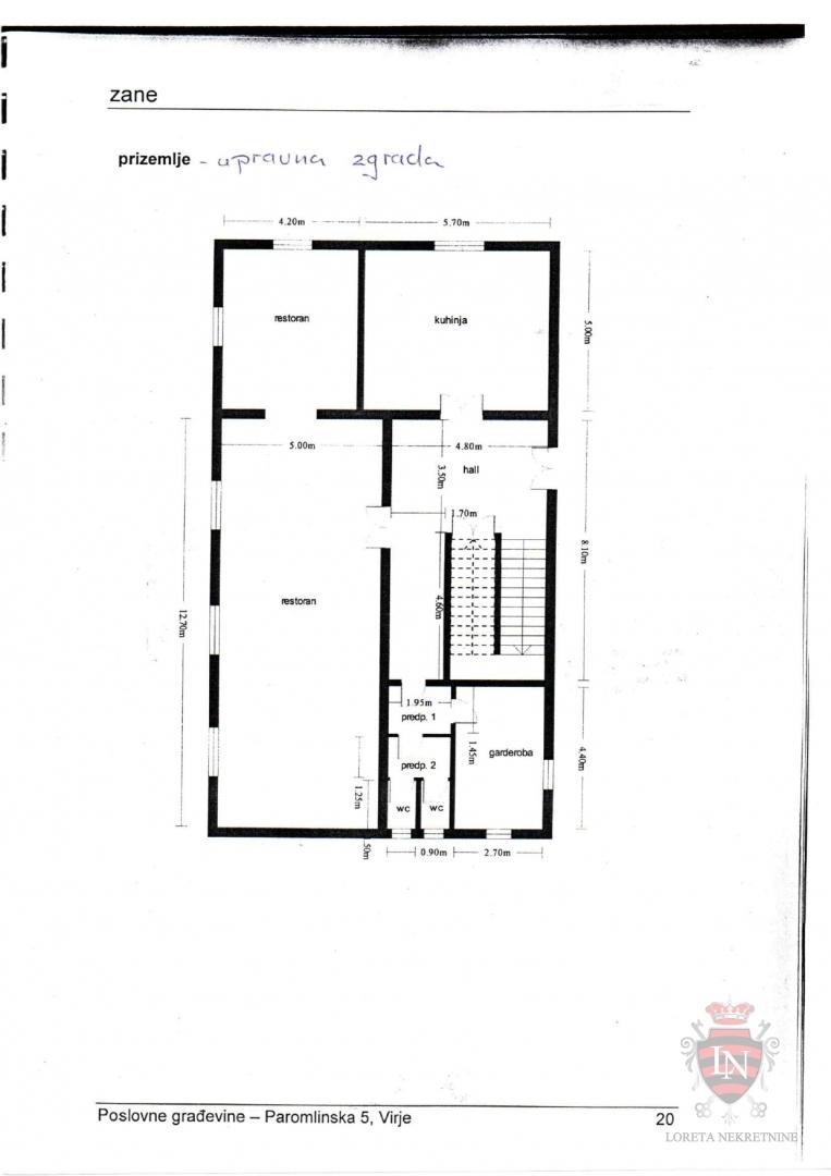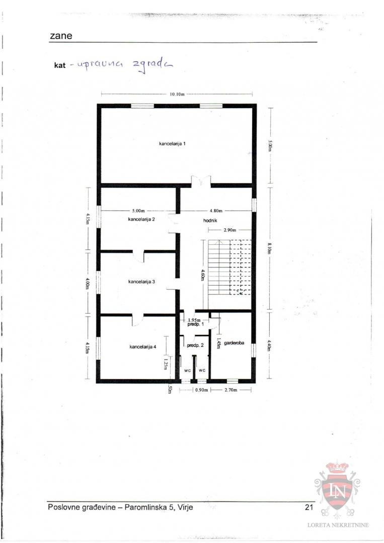 Das Verwaltungsgebäude besteht aus einem Untergeschoss, Erdgeschoss und 1. Obergeschoss. Im Erdgeschoss befinden sich 5 Büroräume, Küche und WC (Waschbecken und WC) sowie ein Flur. Im ersten Stock befinden sich drei Büroräume, ein komplettes Badezimmer und ein Flur. Es gibt auch einen größeren Raum, der früher als Klassenzimmer genutzt wurde und derzeit als Wohnzimmer genutzt wird, d.h. die gesamte Etage wurde zu einer Wohnung umgebaut.