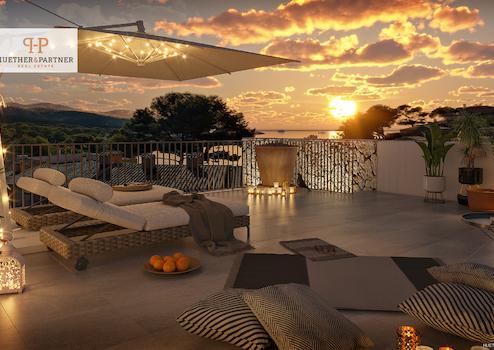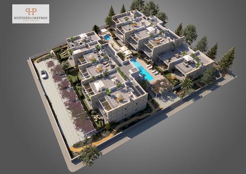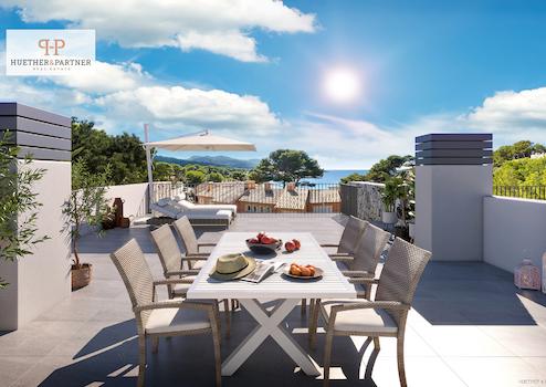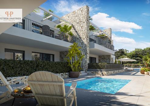 Im Erdgeschoss erwarten Sie große Terrassen mit überdachten Veranden und privaten Gärten. Die Penthouse-Wohnungen punkten mit herrlichem Meerblick und einer privaten Dachterrasse, die über eine Treppe von der Hauptterrasse aus zugänglich ist.