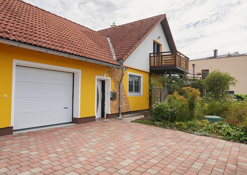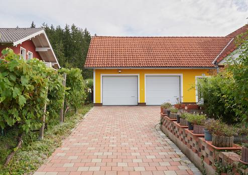 Eine großzügige Doppelgarage mit drei elektrischen Toren ermöglicht bequemes Parken für mehrere Fahrzeuge und Durchfahrt in den Garten.