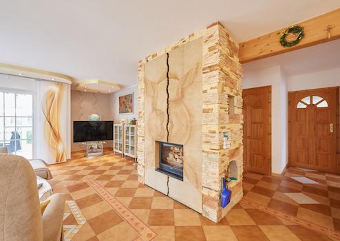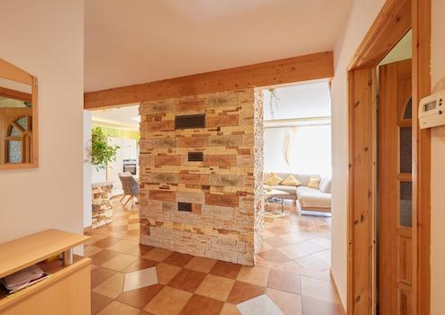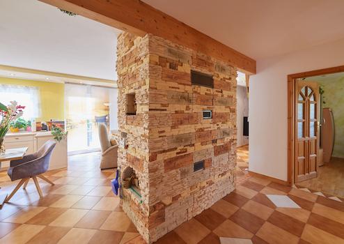 Innenausstattung: Das Haus überzeugt mit hochwertigen Materialien, darunter Massivholz-Innentüren und einem Holzofen mit Lüftungsschächten, die das Obergeschoss mit angenehmer Wärme versorgen.