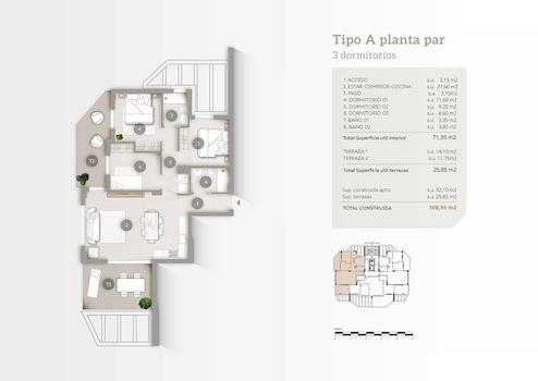Die hochwertige Ausstattung der Wohnungen beinhaltet PVC- oder Aluminiumfenster mit Doppelverglasung und elektrischen Rollläden, Sicherheitstüren, Einbauküchen mit Ober- und Unterschränken, Backofen, Induktionskochfeld, Dunstabzugshaube und Kühlschrank, Einbauschränke in den Schlafzimmern, Badezimmer mit Möbeln und Duschtrennwänden, Vorinstallation Klimaanlage, Videogegensprechanlage und eine aerothermische Anlage zur ökologischen Erzeugung von heißem Brauchwasser. Und zu jedem Appartement gehört ein Tiefgaragenstellplatz.