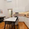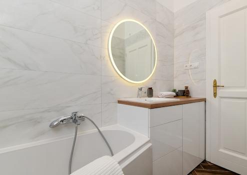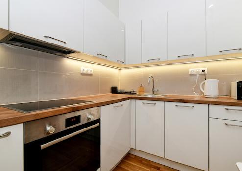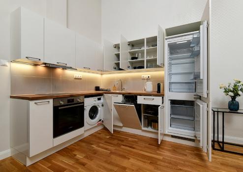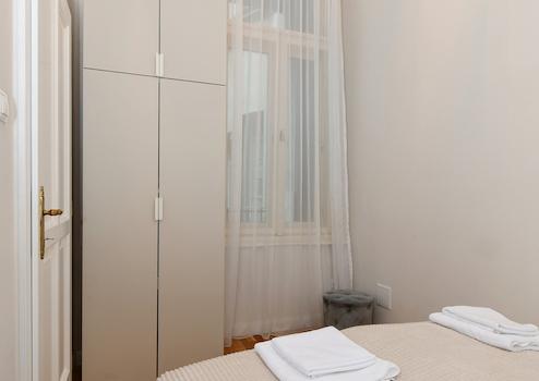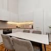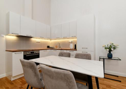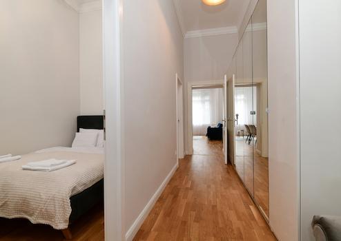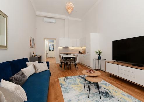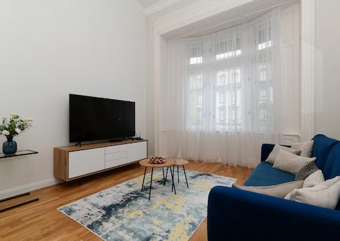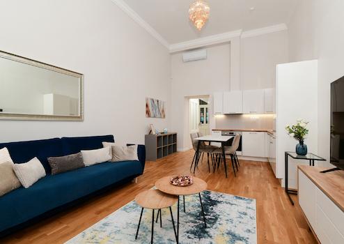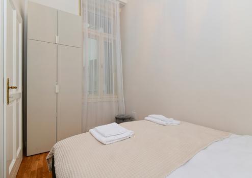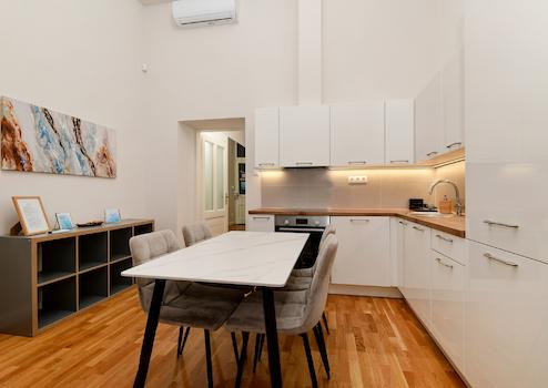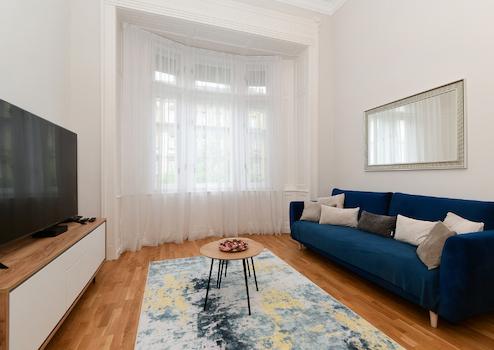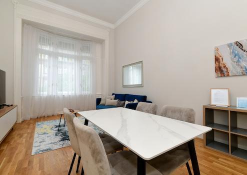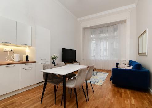 Die Aufteilung ist praktisch und komfortabel: Küche und Wohnzimmer, offen zum Esszimmer, bilden einen luftigen Raum, der dank seiner Südwestausrichtung viel Tageslicht erhält. Das Wohnzimmer blickt auf den Szent István Boulevard, während das separate Schlafzimmer auf den ruhigen Innenhof blickt und so für erholsame Entspannung sorgt.