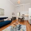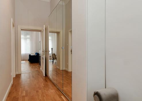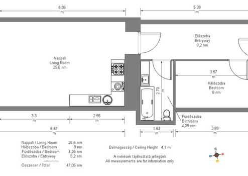 Az elrendezés praktikus és kényelmes: az étkezővel egybenyitott konyha és nappali egy légteret alkot, amely természetes fényt kap délnyugati tájolásának köszönhetően. A nappali a Szent István körútra néz, míg a külön hálószoba a csendes, belső udvarra néz, biztosítva a nyugodt pihenést.