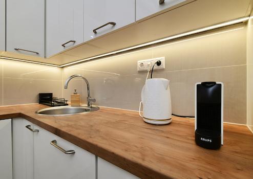 A lakás modern kényelmi megoldásokkal is fel van szerelve: hűtő-fűtő klíma gondoskodik az optimális hőmérsékletről egész évben, elektromos redőnyök biztosítják a kellemes árnyékolást, a riasztó pedig a biztonságérzetet.