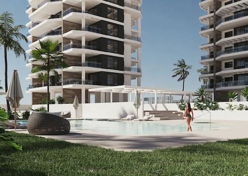 Appartements mit 2 Schlafzimmern, 2 Badezimmern, Klimaanlage, Tiefgaragenstellplatz, Gemeinschaftspool und Meerblick nur 200 m vom Strand