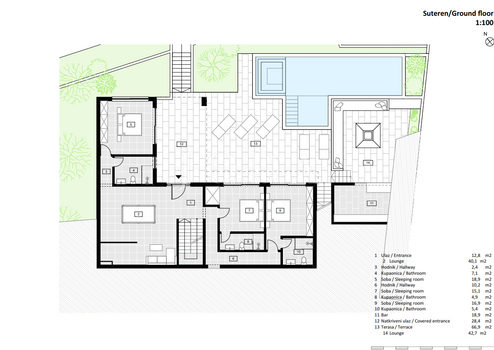 Im Erdgeschoss befinden sich drei Schlafzimmer, jeweils mit eigenem Bad, und ein Wohnbereich mit Zugang zu einem angelegten Garten mit beheiztem Pool und Whirlpool sowie einer großzügigen Terrasse mit Sonnendeck.