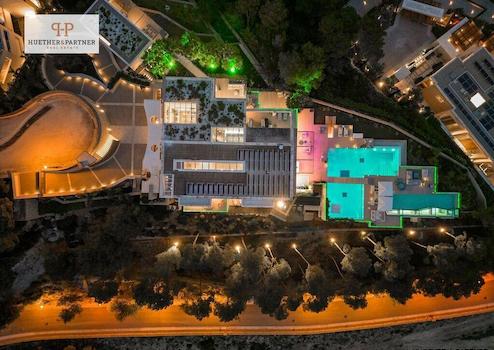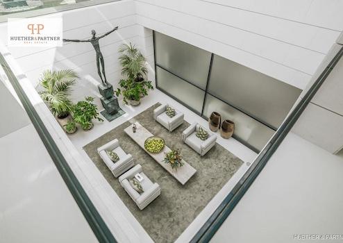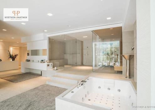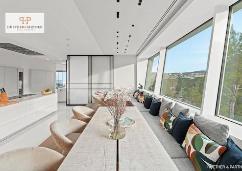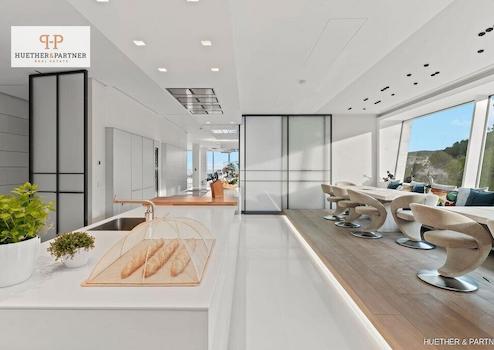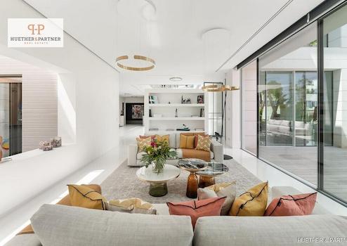 Der Außenbereich besticht durch eine weitläufige Sonnenterrasse mit balinesischen Liegen und einem großen Außenpool mit automatisierter Abdeckung, der sich bei Bedarf in einen Hubschrauberlandeplatz verwandeln lässt – ein absolutes Unikat. Der Blick auf das Meer und die Skyline von Palma ist atemberaubend.