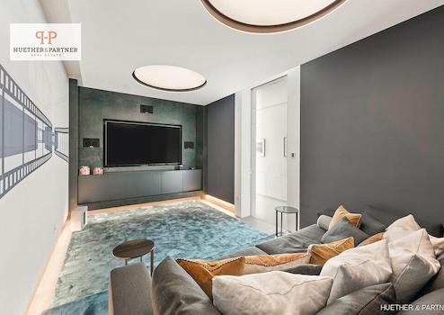 Die mittlere Etage bildet den Wohnmittelpunkt: ein weitläufiges, elegant gestaltetes Wohnzimmer, ein offener Küchenbereich mit Show-Cooking-Zone, ein separates Esszimmer und ein gemütlicher TV-Raum bieten höchsten Wohnkomfort.