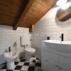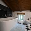 Vom Wohnbereich mit Gäste-WC und Terrasse führt eine Treppe ins Obergeschoss mit zwei Schlafzimmern und Bad, danach weiter ins hohe Dachgeschoss mit Master-Schlafzimmer, Arbeitsbereich und eigenem Bad mit Badewanne.