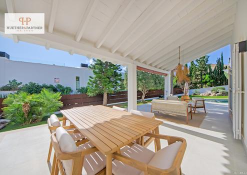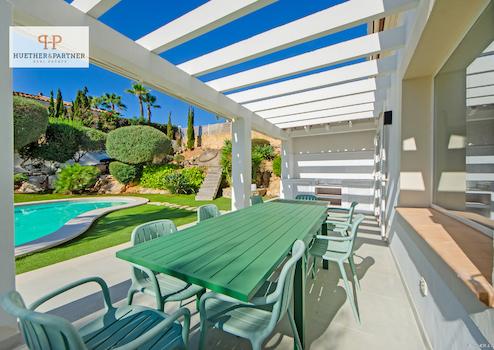 Besonders hervorzuheben ist der außergewöhnlich gestaltete Außenbereich: Großzügige Terrassenflächen, umrahmt von mediterraner Vegetation, bilden das Herzstück des Anwesens. Der architektonisch eindrucksvolle Swimmingpool mit eleganter Formgebung schafft eine einmalige Symbiose aus Design und Natur. Hier lassen sich entspannte Sonnentage ebenso genießen wie stilvolle Abendveranstaltungen unter freiem Himmel.