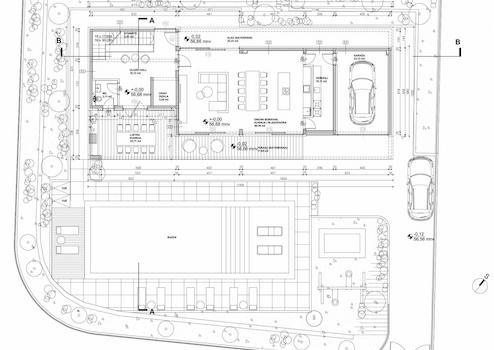 The ground floor houses a garage, laundry room, and a large open-plan living room with a modern kitchen and dining area. From the living room, you can step out onto a terrace with a covered summer kitchen and an outdoor pool complete with showers and sunbathing space.