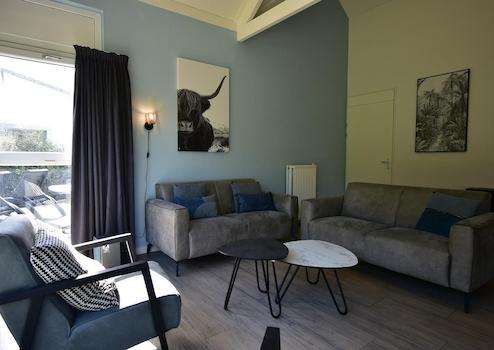 Das moderne Wohnzimmer bildet das Herz dieses Ferienhauses mit großen Fenstern, die für viel natürliches Licht und Ausblick auf die grüne Umgebung sorgen. Die mechanische Belüftung garantiert immer frische Luft, während die Terrassentüren direkten Zugang zur Holzterrasse. Die neutralen Farben und moderne Einrichtung schaffen eine ruhige, entspannte Atmosphäre. Der Raum bietet ausreichend Platz für eine komfortable Sitzecke und ist ideal zum Entspannen nach einem Tag am nahen Nordseestrand. Die perfekte Innen-Außen-Verbindung macht dieses Wohnzimmer zum idealen Ort für gesellige Abende während Ihres Urlaubs im Roompot Strandpark Duynhille.