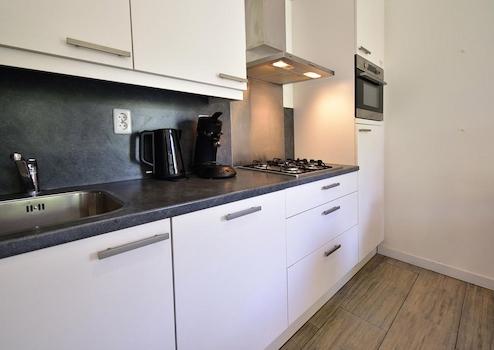 Die voll ausgestattete Küche verbindet Funktionalität mit moderner Anmutung. Alle notwendigen Einbaugeräte, einschließlich Kombibackofen und Gaskochfeld, sind für optimalen Kochkomfort vorhanden. Die schlichte weiße Oberfläche und die praktische Arbeitsplatte bieten reichlich Platz für kulinarische Kreationen. Die offene Verbindung zum Wohn- und Esszimmer ermöglicht gemütliches gemeinsames Kochen. Perfekt für die Selbstversorgung während Ihres Aufenthalts im Roompot Strandpark.
