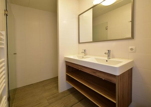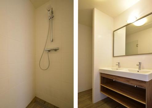 Das moderne Badezimmer bietet optimalen Komfort mit einem Doppelwaschbecken und stilvollem Holz-Badmöbel. Die geräumige begehbare Dusche mit Holzoptik Boden sorgt für ein luxuriöses Duscherlebnis. Der große Spiegel und praktischer Stauraum machen die tägliche Routine einfach. Die neutralen Farben und moderne Ausstattung schaffen eine zeitlose, spa-ähnliche Atmosphäre. Dieses Badezimmer erhöht den Komfort und den Mietwert des Ferienhauses erheblich.