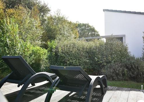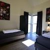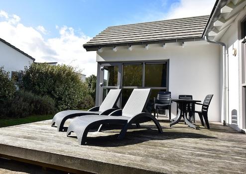 Das komfortable Hauptschlafzimmer bietet optimale Ruhe mit einem geräumigen Doppelbett und direktem Zugang zur Holzterrasse. Viel natürliches Licht durch die großen Fenster und stilvolle Wanddekoration schaffen eine beruhigende Atmosphäre. Der direkte Zugang zur Terrasse ermöglicht es, morgens sofort die Sonne zu genießen. Dieses Schlafzimmer bildet eine private Oase innerhalb des Ferienhauses, ideal für eine entspannte Nachtruhe nach einem Tag am Strand.