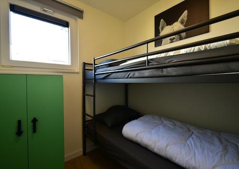 Das praktische Kinderschlafzimmer ist mit einem modernen Etagenbett ausgestattet, das den verfügbaren Raum optimal nutzt. Der grüne Schrank bietet viel Stauraum für Kleidung und Spielzeug, während die mechanische Belüftung für ein gesundes Raumklima sorgt. Das Fenster sorgt für natürliches Licht und frische Luft. Die fröhliche und funktionale Einrichtung macht dieses Zimmer perfekt für Kinder jeden Alters. Dieses Schlafzimmer ist ideal für Familien, die einen Urlaub im Roompot Strandpark genießen, wobei Kinder ihren eigenen Raum zum Schlafen und Spielen haben.