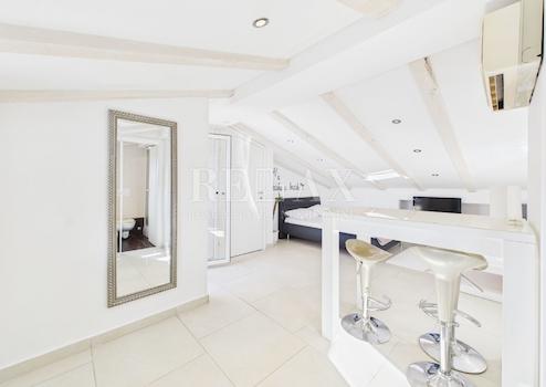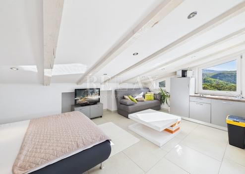 Vom Eingangsflur im unteren Geschoss führt eine Innentreppe ins Obergeschoss, wo sich ein separates Studio-Apartment mit 20,78 m² befindet. Das Studio verfügt über ein eigenes Badezimmer und Zugang zu einer Terrasse mit freiem Meerblick.