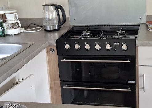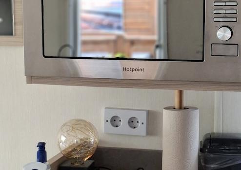 Offene Küche mit Mikrowelle, Herd mit Backofen.