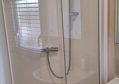 Badezimmer mit geräumiger Dusche und WC-Möbeln mit Spiegel