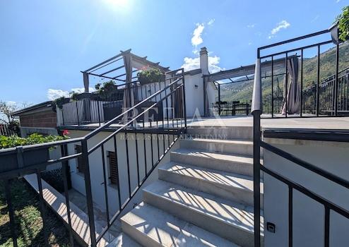Im Keller befinden sich zwei Konobas, eine davon als Spiel- oder Aufenthaltsraum gestaltet. Das Erdgeschoss umfasst eine 82 m² große Wohnung mit offenem Wohnbereich, Küche und Esszimmer mit Zugang zum Balkon, zwei Schlafzimmern und einem Badezimmer. Im Dachgeschoss befindet sich ein Raum mit Sauna sowie eine große Terrasse mit Whirlpool und Gartenmöbeln – ideal zum Entspannen und Genießen im Freien.