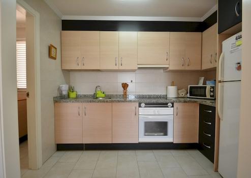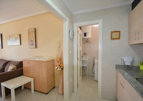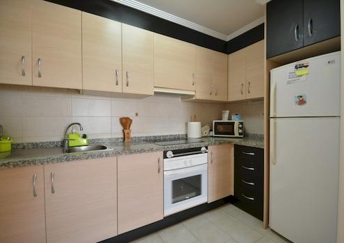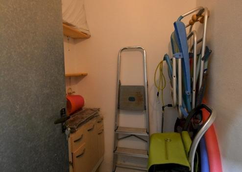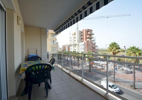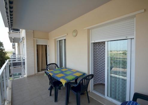 Im Inneren finden Sie eine möblierte Wohnung mit zwei Schlafzimmern und einem Badezimmer. Das Hauptschlafzimmer verfügt über einen Einbauschrank und das Badezimmer ist mit einer Badewanne ausgestattet. Die Küche ist offen gestaltet, komplett mit Elektrogeräten ausgestattet und verfügt über einen praktischen Hauswirtschaftsraum. Die Terrasse ist mit einer Markise ausgestattet, die Schatten spendet. Zusätzlich zur Wohnung verfügen Sie über einen privaten Abstellraum im Keller und einen eigenen Parkplatz in der Anlage.