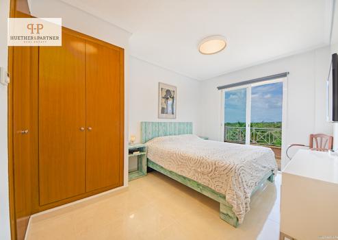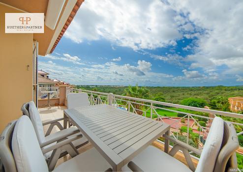 Dieses Penthouse ist luxuriös eingerichtet und erfüllt die Ansprüche gehobener Wohnkultur. Es bietet einen beeindruckenden Panoramablick auf den Poolbereich, das Meer und die umliegenden Berge, der von großen, bodentiefen Fenstern und einer offenen Gestaltung optimal eingefangen wird.