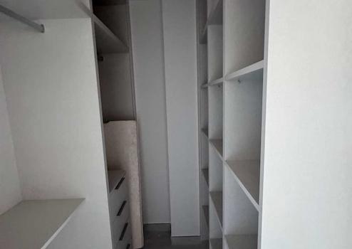 Schlafzimmer & Badezimmer: 1 Schlafzimmer mit begehbarem Kleiderschrank. Ein großzügiges Badezimmer mit begehbarer Dusche, Handtuchheizkörper sowie zusätzlichem Abstellraum mit maßgefertigten Regalen und Kleiderstangen.