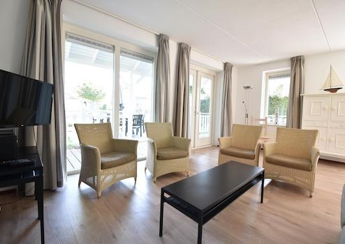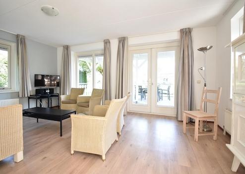 Das stilvolle Wohnzimmer bildet das Herz dieses Wasserfront-Ferienhauses mit Rattanstühlen, die sofort Urlaubsgefühl wecken. Die großen Terrassentüren schaffen eine nahtlose Verbindung zur Terrasse und zur Oosterschelde, sodass Innen- und Außenbereich vollständig verschmelzen. Der schwarze Couchtisch und der moderne TV sorgen für allen Komfort und Unterhaltung. Die neutralen Farben und praktische Aufteilung nutzen den verfügbaren Raum optimal. Große Fenster sorgen für viel natürliches Licht und einen atemberaubenden Blick aufs Wasser. Die Rattanstühle mit weichen Kissen bieten einen herrlichen Sitzplatz, um die Ruhe und die einzigartige Wasserlage zu genießen. Dieses Wohnzimmer ist der ideale Ort, um sich zu entspannen, Gesellschaft zu haben oder die Aussicht zu genießen.