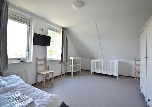 Das geräumige Hauptschlafzimmer im Obergeschoss bietet mit einem bequemen Boxspringbett und modernen Möbeln optimale Erholung. Die Fenster sorgen für viel Tageslicht und eine gemütliche Atmosphäre. Der große Fernseher und praktische Stauschränke vervollständigen dieses Schlafzimmer. Die neutralen Farben und die Oberlichter schaffen eine erholsame Umgebung mit einem schönen Blick auf die Umgebung. Dieses Hauptschlafzimmer ist eine private Oase für einen erholsamen Schlaf nach einem Tag voller Aktivitäten.