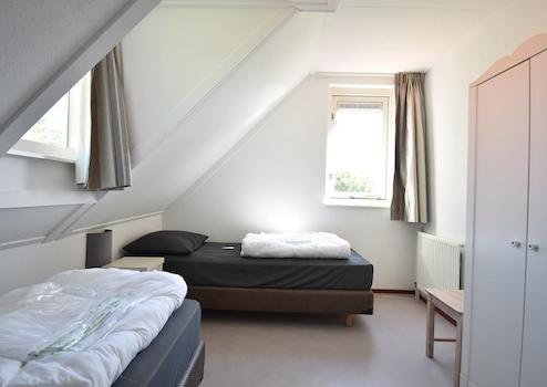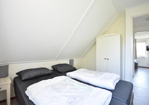 Das zweite Schlafzimmer im Obergeschoss verfügt über zwei bequeme Boxspringbetten, ideal für Kinder oder Gäste. Die neutralen Farben und die praktische Aufteilung machen dieses Zimmer für unterschiedliche Schlafbedürfnisse geeignet. Das Fenster bietet einen Blick auf die grüne Umgebung von Aquadelta. Dieses Schlafzimmer bietet maximalen Komfort auf kleinstem Raum, so dass sich jeder voll und ganz wohlfühlen kann.