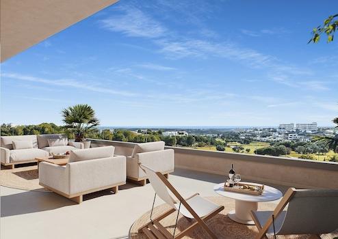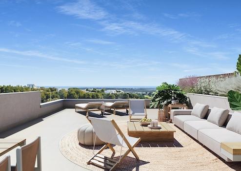 Dank der großzügigen privaten Terrasse lässt sich der Wohnraum mühelos nach draußen erweitern. Ab dem ersten Stock genießen Sie zudem einen wunderschönen Ausblick auf das Mittelmeer und den angrenzenden Golfplatz.