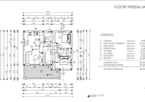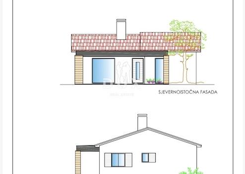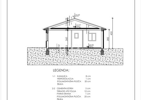 Die Baugenehmigung bezieht sich auf den Bau eines einstöckigen Hauses mit Flur, Küche mit Ess- und Wohnzimmer, Flur, zwei Schlafzimmern, zwei Bädern und einer überdachten Terrasse (20 m²).