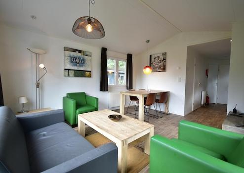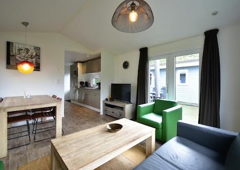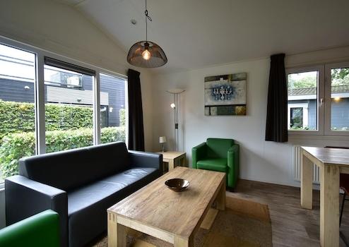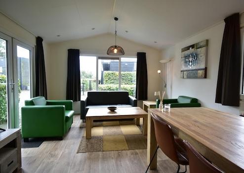 Dieses brandneue Chalet aus 2020 im Bad Hoophuizen kombiniert moderne Architektur mit der natürlichen Schönheit der Veluwe. Die ebenerdige Aufteilung bietet zwei Schlafzimmer, ein Badezimmer mit Toilette und eine offene Wohn-Essküche, perfekt für Familien oder als Investition. Das Chalet liegt am ruhigen Rand des Parks mit wunderschönem Blick auf Wälder und einen Bach, was für optimale Ruhe und Privatsphäre sorgt. Die gemütliche Terrasse mit Gartenmöbeln lädt zur Entspannung im Freien ein, während die moderne Einrichtung mit grünen Sesseln und Holzakzenten eine warme Atmosphäre schafft. EuroParcs Vermietungsmöglichkeiten machen dies zu einer attraktiven Investition mit garantierten Einnahmen und professioneller Verwaltung. Die vollständig ausgestattete Küche mit taupefarbenen Schränken und modernen Einbaugeräten bietet allen Komfort für Selbstversorgung. Die Lage im Bad Hoophuizen bietet Zugang zu umfangreichen Freizeiteinrichtungen und der wunderschönen Natur der Veluwe mit Wander- und Radwegen durch Wälder und Heidegebiete. Dieses moderne Chalet aus 2020 bietet die perfekte Kombination aus Komfort, Natur und Investitionsmöglichkeiten an einem der schönsten Orte der Veluwe.