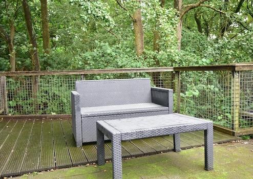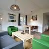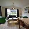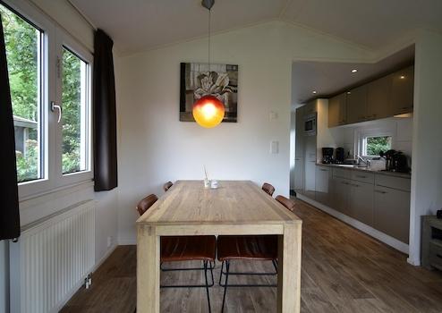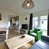 Das moderne Wohnzimmer bildet das Herz dieses Chalets mit einer offenen Aufteilung, die nahtlos in Esszimmer und Küche übergeht. Die stilvollen grünen Sessel und das schwarze Sofa schaffen eine warme, einladende Atmosphäre, während die großen Fenster für viel natürliches Licht und wunderschönen Blick auf die waldreiche Umgebung sorgen. Der Holz-Couchtisch und moderne Beleuchtung vervollständigen die zeitgemäße Einrichtung. Über die Terrassentüren erreichen Sie direkt die gemütliche Terrasse, perfekt für Indoor-Outdoor-Living. Der Raum bietet ausreichend Platz für Entspannung nach einem Tag voller Aktivitäten in der wunderschönen Natur von Bad Hoophuizen. Die neutralen Farben und moderne Einrichtung machen dieses Wohnzimmer zum idealen Ort für gesellige Abende während Ihres Urlaubs in der Veluwe.