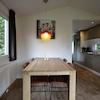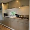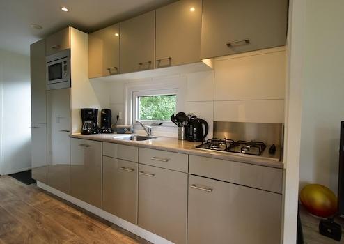 Die vollständig ausgestattete Küche kombiniert Funktionalität mit modernem Design durch die stilvollen taupefarbenen Schränke und weißen Arbeitsplatten. Alle notwendigen Einbaugeräte inklusive Mikrowelle und Gasherd sind für optimalen Kochkomfort vorhanden. Das Fenster über der Spüle bietet Blick auf die grüne Umgebung und sorgt für natürliches Licht beim Kochen. Die offene Verbindung zu Wohnzimmer und Esszimmer ermöglicht geselliges Kochen. Perfekt für Selbstversorgung während Ihres Aufenthalts im Bad Hoophuizen.