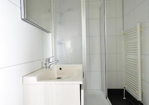 Das moderne Badezimmer bietet optimalen Komfort mit einer praktischen Bad-Dusch-Kombination, Waschbecken mit großem Spiegel und integrierter Toilette. Die weißen Fliesen und moderne Beleuchtung schaffen eine frische, saubere Ausstrahlung, während das Fenster für natürliches Licht und Belüftung sorgt. Die funktionale Aufteilung nutzt den verfügbaren Raum optimal. Das Badmöbel bietet Stauraum für Toilettenartikel. Dieses komplette Badezimmer erfüllt alle Bedürfnisse und erhöht den Komfort des Chalets erheblich während Ihres Aufenthalts im Bad Hoophuizen.