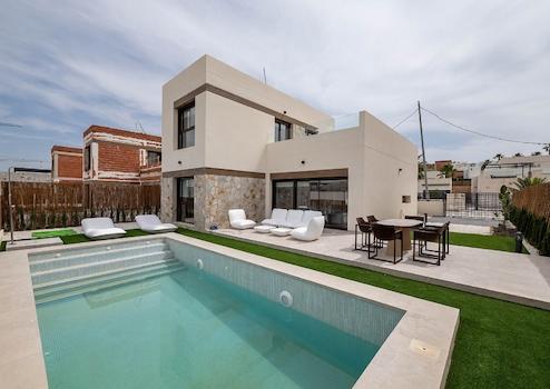 Diese stilvolle Villa mit drei Schlafzimmern und zwei modernen Badezimmern überzeugt durch ihre durchdachte Raumaufteilung über zwei Etagen sowie durch hochwertige Ausstattung und ein ansprechendes, zeitloses Design. Der private Swimmingpool und ein eigener Parkplatz auf dem Grundstück bieten Komfort und Privatsphäre - ideal für alle, die ein entspanntes Leben unter der Sonne Spaniens suchen.