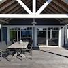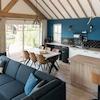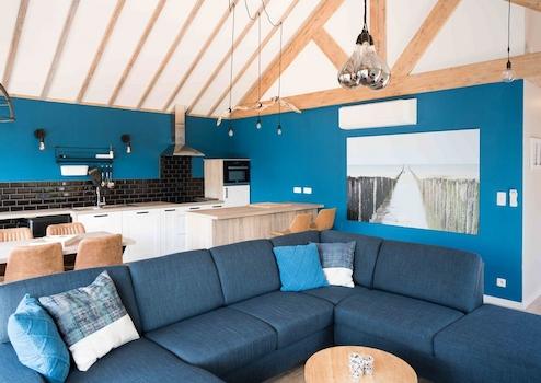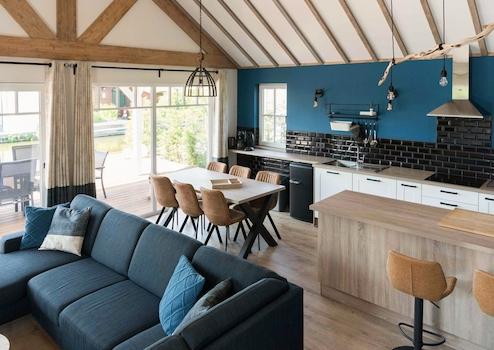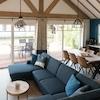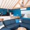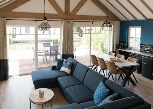 Das luxuriöse Wohnzimmer bildet das Herz dieses Wasser-Ferienhauses mit spektakulären Holzbalken, die für eine einzigartige, räumliche Ausstrahlung sorgen. Die auffällige blaue Akzentwand schafft eine moderne, stilvolle Atmosphäre, die perfekt zur Wasserlage passt. Das komfortable Ecksofa bietet reichlich Platz für Entspannung und Geselligkeit. Die großen Terrassentüren schaffen eine nahtlose Verbindung zur Terrasse und zum eigenen Steg, sodass Innen- und Außenbereich vollständig verschmelzen. Das natürliche Licht, das durch die großen Fenster hereinströmt, verstärkt die räumliche Ausstrahlung. Die moderne Beleuchtung und durchdachte Aufteilung machen dieses Wohnzimmer zum perfekten Ort, um den Wasserblick und die Ruhe des Ferienparks De Groote Vliet zu genießen.