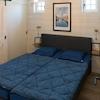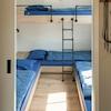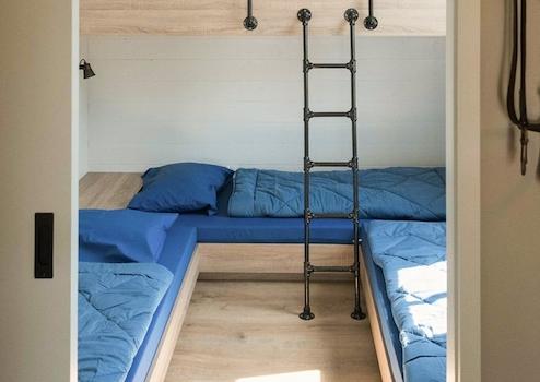 Das clevere Schlafzimmer mit vier Etagenbetten bietet optimale Flexibilität für Familien mit Kindern. Die weißen Holzwände schaffen eine frische, helle Atmosphäre. Die praktische Aufteilung maximiert die Raumnutzung innerhalb der 75m² Wohnfläche. Jeder Schlafplatz verfügt über eigene Lesebeleuchtung für zusätzlichen Komfort. Das Fenster sorgt für natürliches Licht und Belüftung. Dieses Schlafzimmer ist perfekt für Kinder, die zusammen schlafen können während des Urlaubs im Ferienpark De Groote Vliet an seiner einzigartigen Wasser lage.