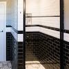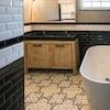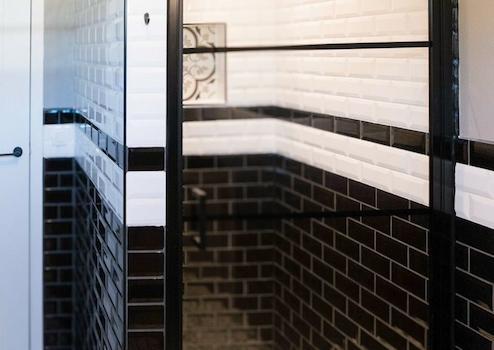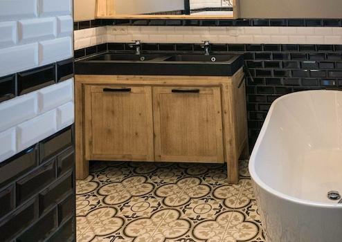 Das luxuriöse Badezimmer bietet optimalen Komfort mit stilvoller begehbarer Dusche mit schwarzen Profilen, Doppelwaschbecken und Holz-Badezimmermöbel. Die Kombination aus schwarz-weißen Metrofliesen und portugiesischen Bodenfliesen schafft eine einzigartige, luxuriöse Ausstrahlung. Der große Spiegel mit moderner Beleuchtung erhöht den Komfort. Die praktische Aufteilung sorgt für optimale Raumnutzung. Dieses komplette Badezimmer erfüllt alle Bedürfnisse und erhöht den Komfort des Wasserfront-Ferienhauses erheblich während Ihres Aufenthalts im Ferienpark De Groote Vliet.