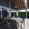 Die luxuriöse Küche kombiniert Funktionalität mit modernem Design durch die stilvolle weiße Kochinsel und die auffälligen schwarzen Metrofliesen. Alle notwendigen Einbaugeräte sind für optimalen Kochkomfort vorhanden. Die Kochinsel bietet zusätzliche Arbeitsfläche und Barplätze für geselliges Beisammensein. Die offene Verbindung zum Wohnzimmer und Essbereich sorgt für soziale Atmosphäre. Perfekt für Selbstversorgung während Ihres Aufenthalts im Ferienpark De Groote Vliet