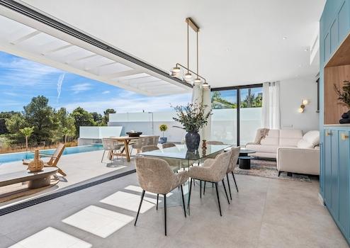 Das Haus überzeugt durch seine klare Architektur, lichtdurchflutete Räume und ein offenes Wohnkonzept, das Komfort und mediterranes Lebensgefühl perfekt vereint. Große Fensterfronten sorgen für ein helles, freundliches Ambiente und schaffen fließende Übergänge zwischen Innen- und Außenbereich.