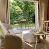 Das gartenorientierte Wohnzimmer ist geräumig, modern und gemütlich. Die Glasschiebewand lässt viel Licht herein.