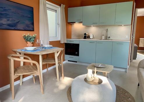 Die Küche ist modern gestaltet und u.a. mit einem Induktionskochfeld mit Dunstabzugshaube, einer Kombi-Mikrowelle, einem Geschirrspüler und einem Kühlschrank mit Gefrierfach ausgestattet.