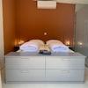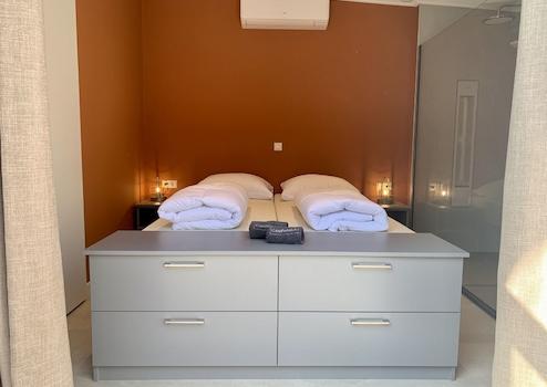 Das Hauptschlafzimmer hat 2 einzelne 80x210 Boxspringbetten, die zusammen stehen. Neben und über dem Bett ist viel Platz für einen Kleiderschrank.